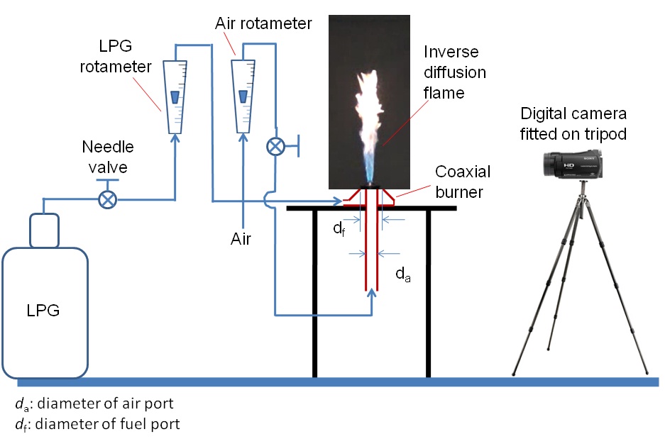 The fuel is set to the desired flow rate using calibrated rotameter and ignited at the tube exit. The air jet velocity is changed using the needle valve to set the desired MR.