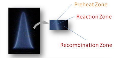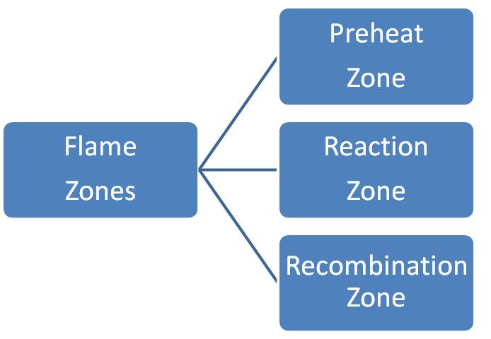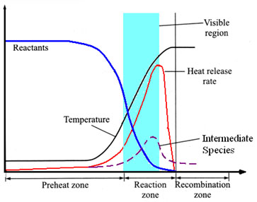 Diffusion of heat and radicals from this zone to preheat zone sustains combustion.