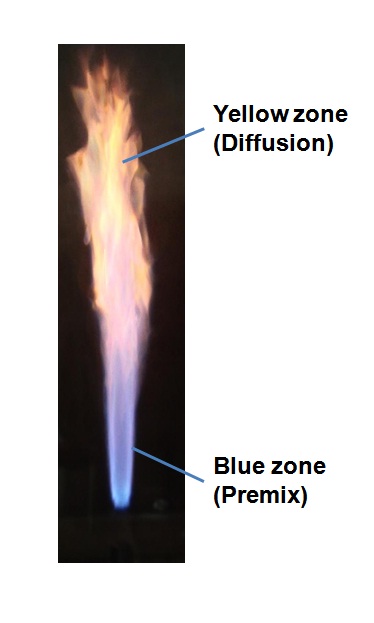 The yellow luminescence is due to the presence of soot particles and the blue premixed is due to CH chemiluminescence signatures.