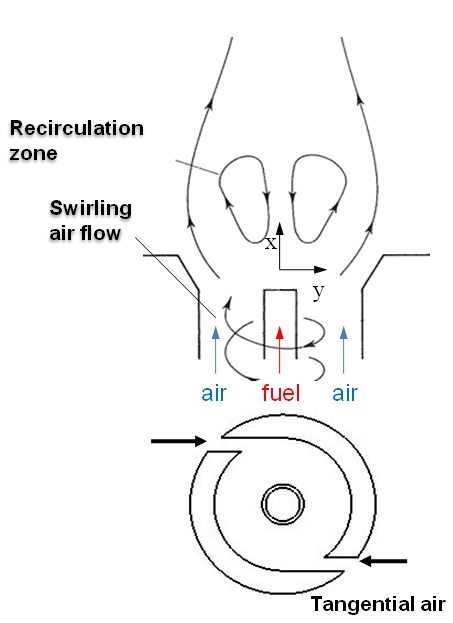 Air is introduced tangentially into a burner to set up swirling flow in addition to axial jet flow.